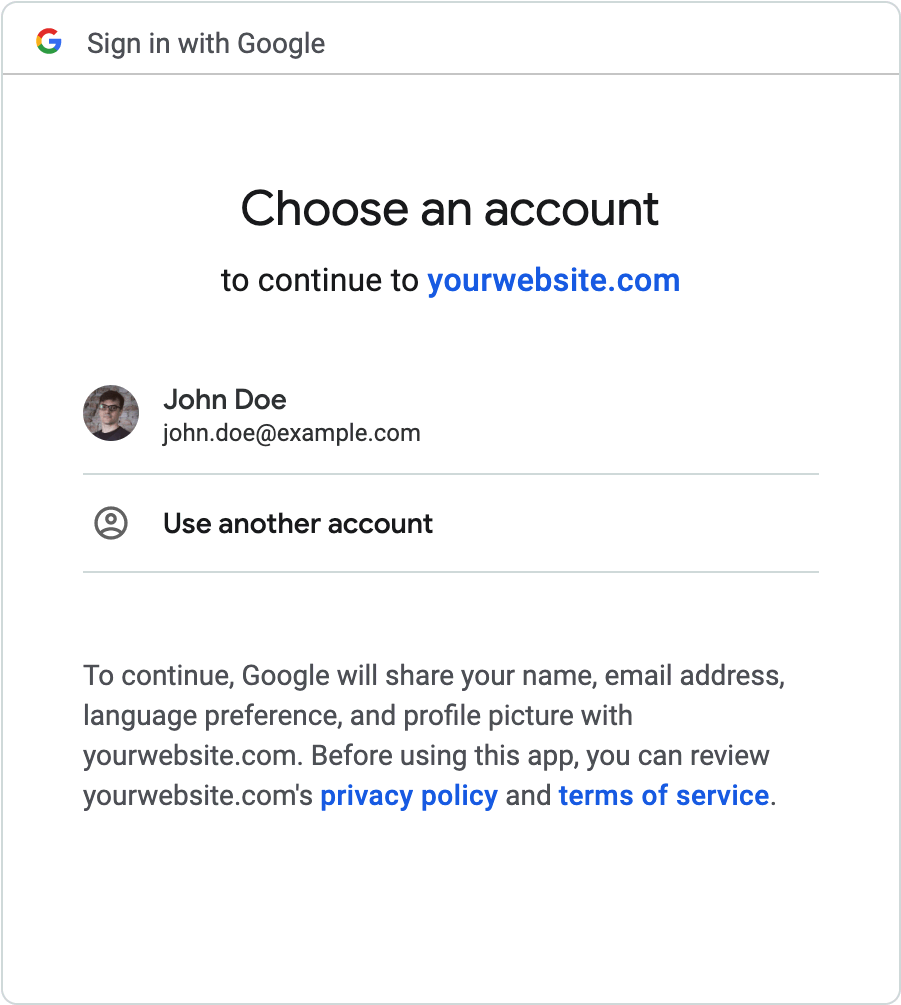 Embed this redirect_url into any button that initiates a Google OAuth flow. Once the Google OAuth flow has begun, the user will see the Google login screen like below.